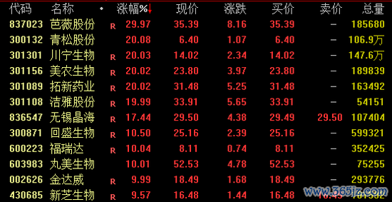 合成生物概念盘中强势拉升,截至收盘,芭薇股份30%涨停,青松股份、川宁生物、洁雅股份、美农生物等20%涨停,回盛生物涨超10%。