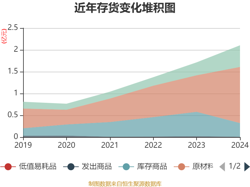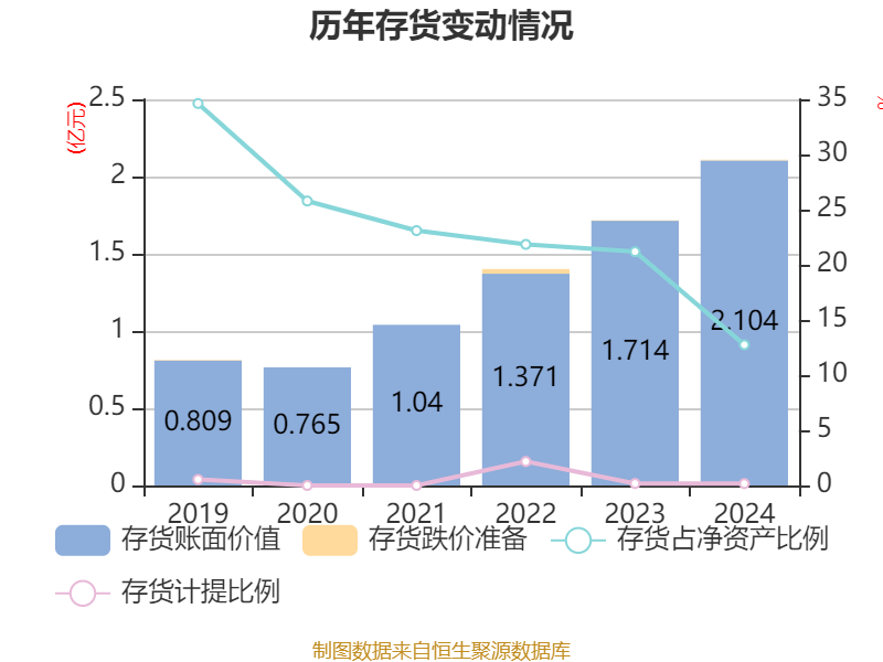 从存货变动来看,截至2024年末,公司存货账面价值为2.1亿元,占净资产的12.75%,较上年末增加3902.55万元。其中,存货跌价准备为36.16万元,计提比例为0.17%。